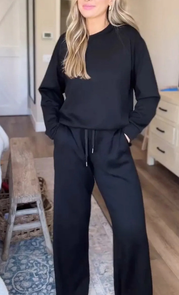 Womens Solid-Color Casual Crew-Neck Pullover Hoodie And Wide-Leg Pants Two-Piece Set