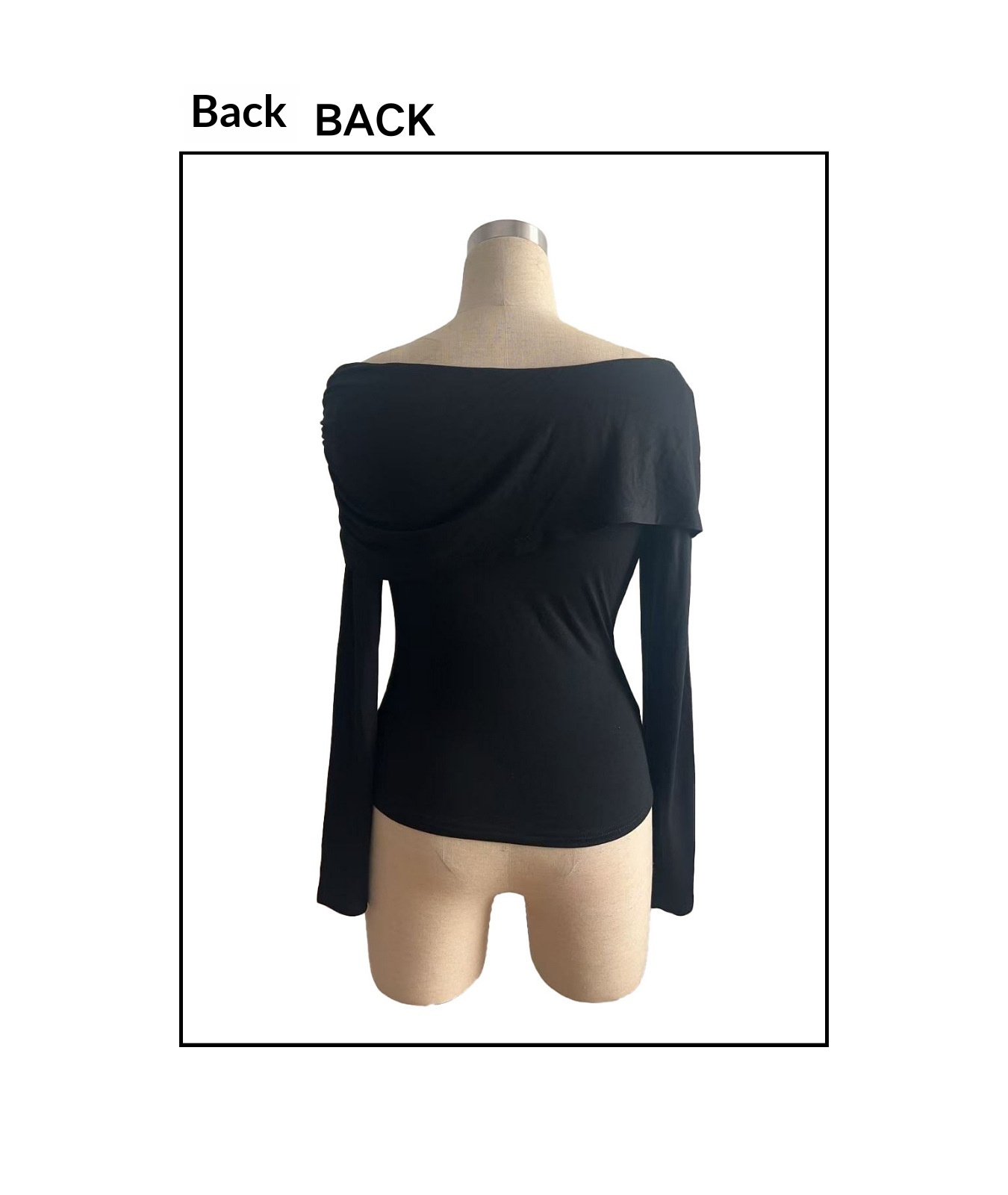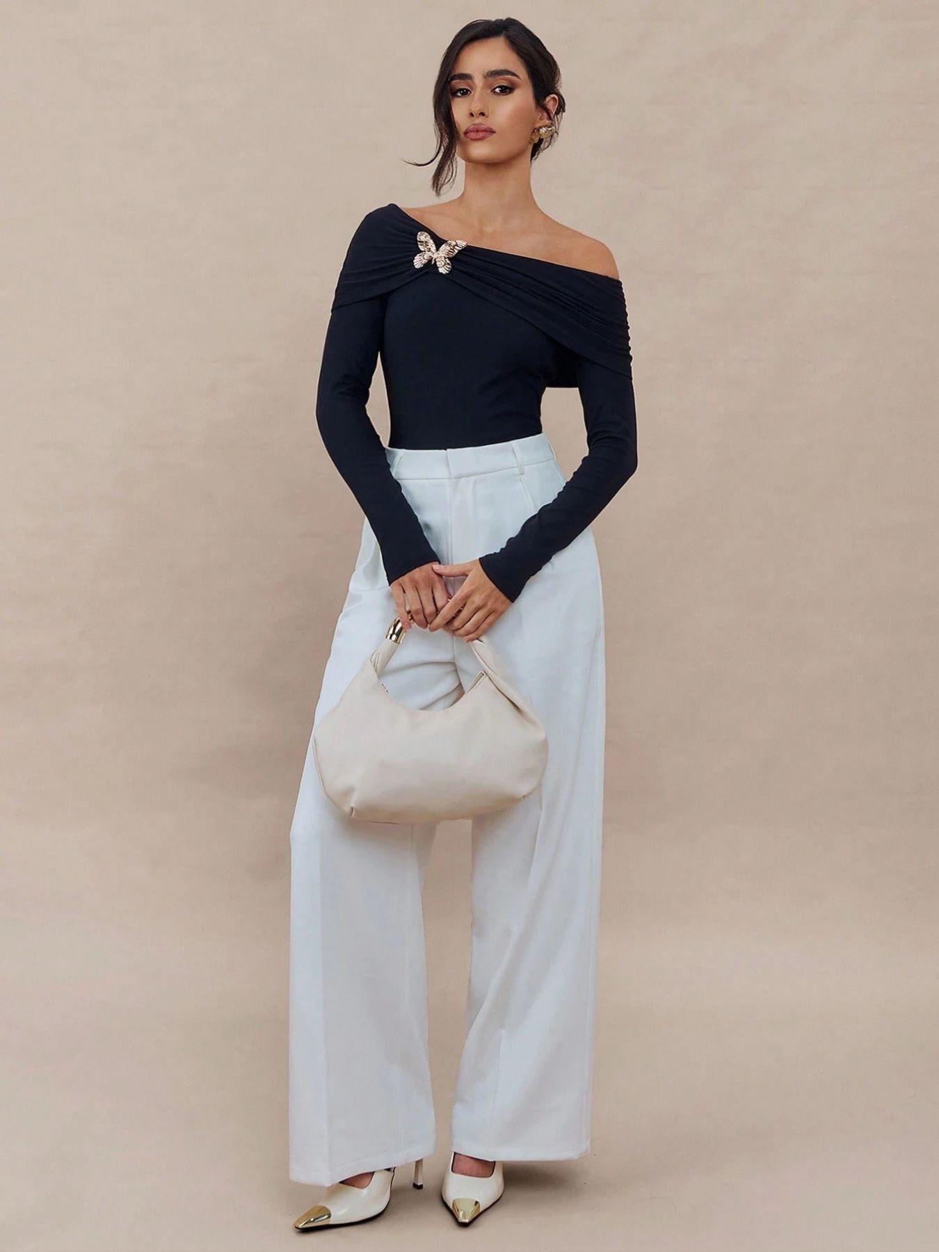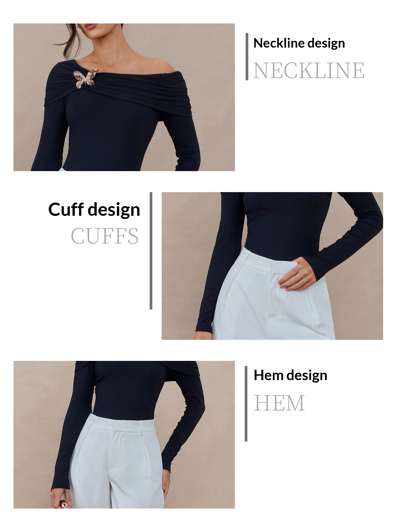 Womens Solid-Color Off-the-Shoulder Butterfly Brooch Long-Sleeve Top
